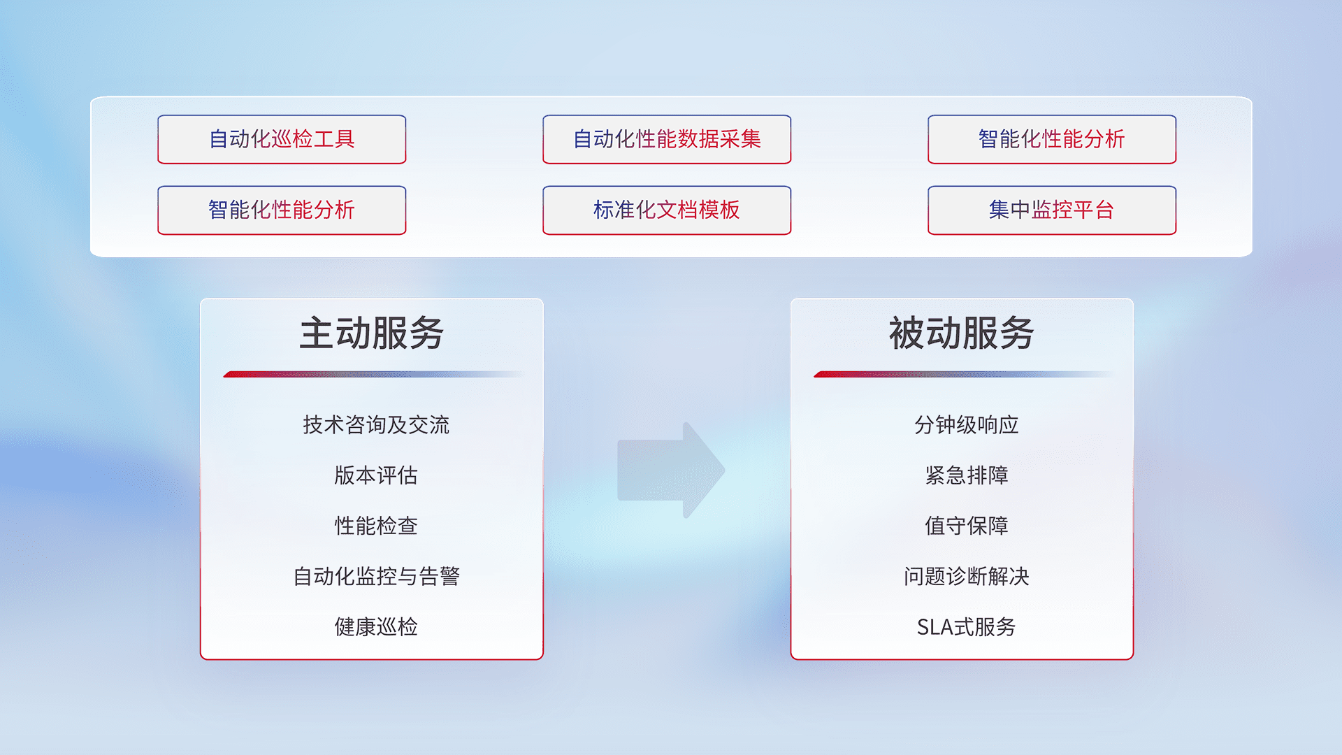 智能化工具和标准化文档,,,,保障服务质量,,,提供主动服务(包含技术咨询、、、版本评估、、、、性能检查、、自动化监控与告警、、健康巡检)和被动服务包含(分钟级响应、、、、紧急排障、、、值守保障、、、、问题诊断解决、、、、SLA服务)。。。